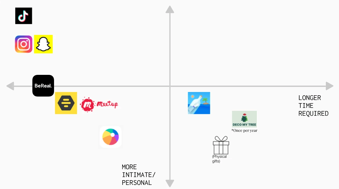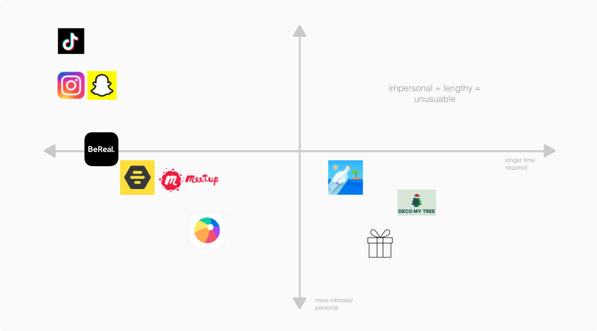 Apps that required less frequent communication (e.g. BeReal or DecoMyTree), with the right gamification aspect, were wildly successful, but users still found fatigue as the apps restructured to become less personal over time.