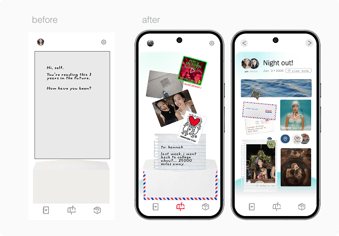 This is when I ideated the feature for Shared Journeys: users can build a world together around their previous memories through designs of their own + add different media.